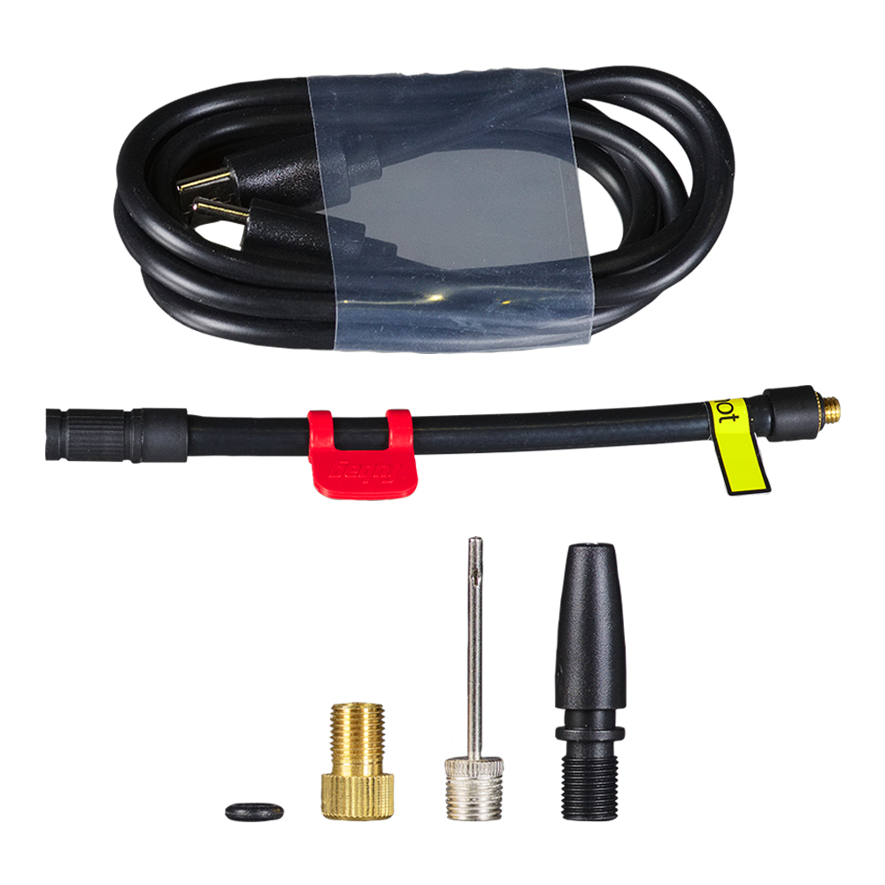 шланг резиновый (съёмный) 170мм (ø 8мм), мешочек для переноски, набор , набор насадок (для накачки мячей – сталь, для накачки колес велосипеда (под тонкий ниппель – латунь, насадка для накачки мячей (универсальная – пластик), инструкция |