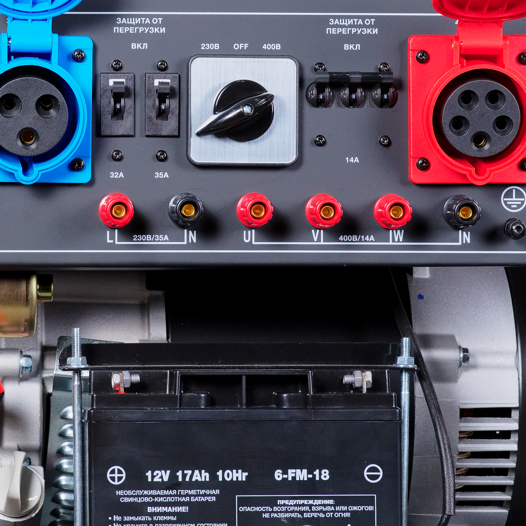 • 1 розетка 230В/16А, 1 силовая розетка 230В/32 А, 1 розетка 400В/16А + клеммы для подключения мощных однофазных и трехфазных потребителей