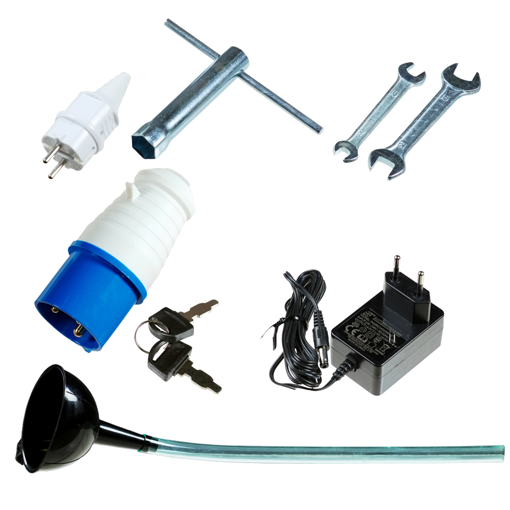 вилка 230В/32А (1 шт) , вилка типа евро 230В/16А (1 шт), свечной ключ с воротком (1 шт) , заливная воронка (1 шт), колеса (2 шт), рукоятки (2 шт), подпятник (2 шт), крепеж для колес и рукояток, ключ зажигания (2 шт) , провода для выхода 12В, ключ 8/10 (1 шт) , ключ 13/15 (1 шт), зарядное устройство для аккумулятора, провода для зарядки аккумулятора , инструкция с сервисным талоном и серийным номером |