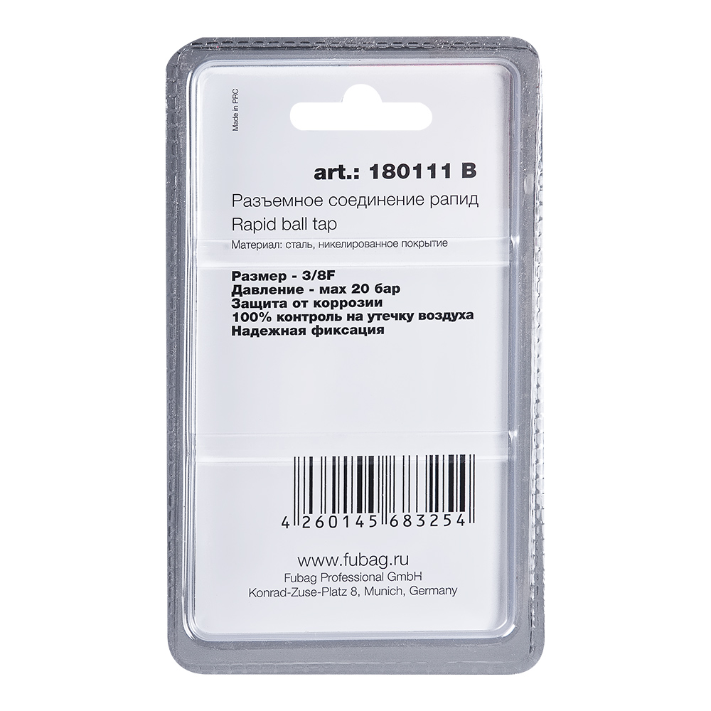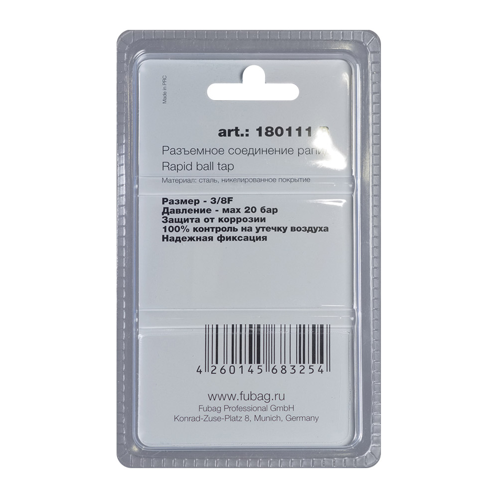 Характеристики FUBAG Разъемное соединение рапид (муфта), 3/8 дюйма F, внутр. резьба, блистер 1 шт