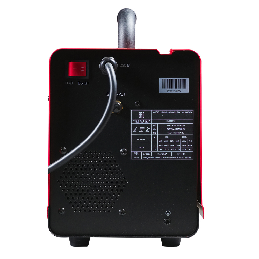 Передняя панель оснащена LED-дисплеем, регуляторами силы тока и скорости подачи проволоки, что позволяет быстро и просто выбирать режимы и оптимальные параметры сварки. Оснащен евроразъемом (EURO) для быстрого и безопасного подключения сварочной горелки. Купив сварочный инвертор IRMIG 200 SYN LED, вы получите в коробке фирменную горелку Fubag 250 А и газовый шланг, а также кабель с электрододержателем и кабель заземления. Продолжительность включения (ПВ) составляет 15% при 40С (в соответствии с европейским стандартом EN60974-1). Сварочный полуавтомат Fubag IRMIG 200 SYN LED обладает легкой сменой полярности для работы с самозащитной проволокой. Эффективная система охлаждения, а также встроенная функция термозащиты с индикацией перегрева гарантируют долговечность и надежность использования аппарата в условиях интенсивной эксплуатации. Все технические характеристики наглядно и подробно указаны на корпусе аппарата.