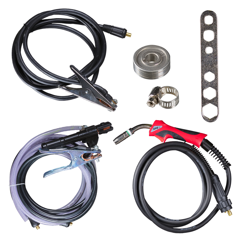 горелка (250 А, 3 м), кабель заземления (25 мм2 х 3 м), кабель с электрододержателем (1,6 м), газовый шланг (3 м) |