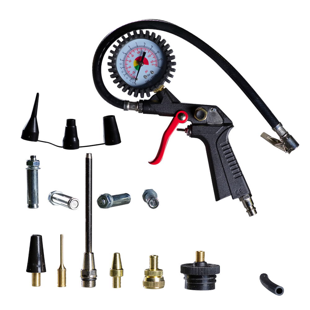 • Пневмопистолет с манометром для удобства контроля давления при накачке;• Удлиненная насадка для продувки;