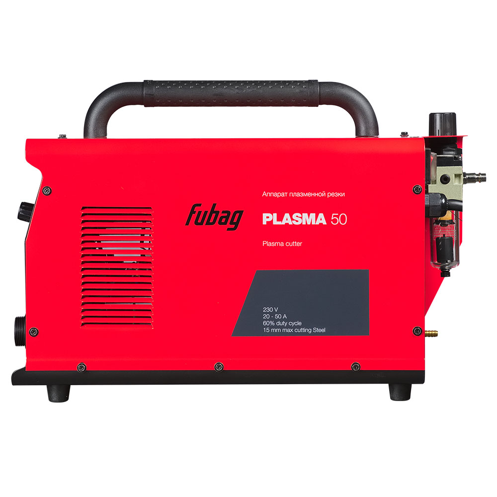 В корпус плазмореза Fubag Plasma 50 интегрирован манометр, по которому пользователь может наблюдать и контролировать выходное давление воздуха, производимого компрессором. В комплекте к аппарату идёт профессиональная горелка для плазмореза FB P60 с длиной рукава 6 метров и медный кабель заземления.