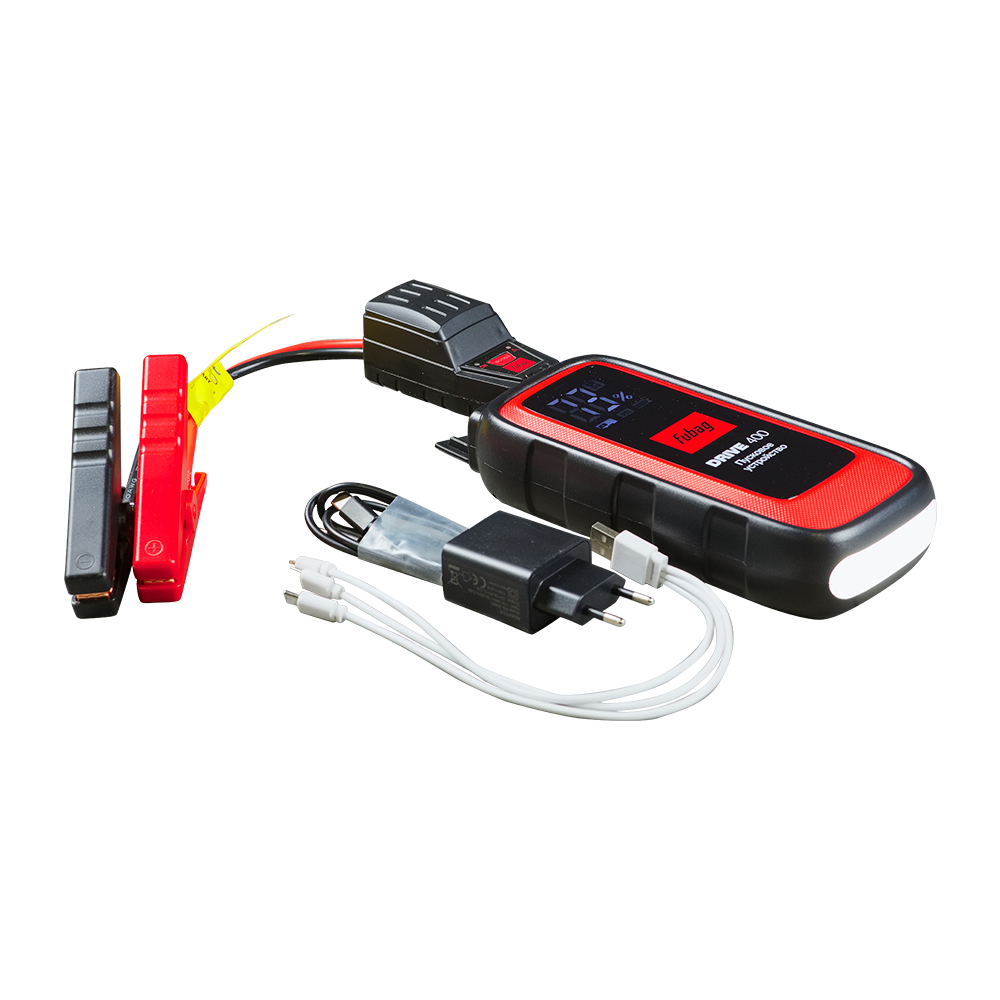 Пусковое устройство FUBAG DRIVE 400 с током запуска 400 А и емкостью аккумулятора 8 000 мАч – отличный выбор для запуска двигателей объемом до 4 л при разряженном штатном аккумуляторе.